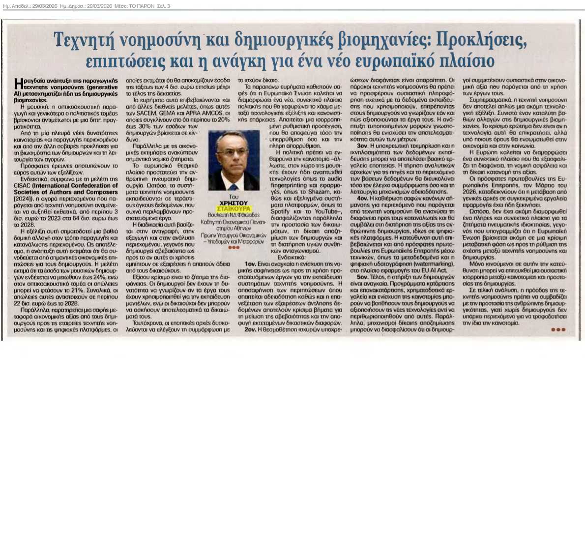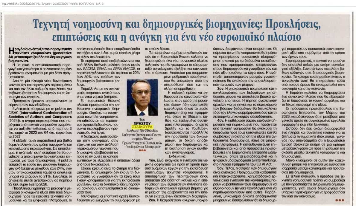 5ον. Τέλος, η στήριξη των δημιουργών είναι αναγκαία. Προγράμματα κατάρτισης και επανακατάρτισης, χρηματοδοτικά εργαλεία και ενίσχυση της καινοτομίας μπορούν να βοηθήσουν τους δημιουργούς να αξιοποιήσουν τις νέες τεχνολογίες αντί να περιθωριοποιηθούν από αυτές. Παράλληλα, μηχανισμοί δίκαιης αποζημίωσης μπορούν να διασφαλίσουν ότι οι δημιουργοί συμμετέχουν ουσιαστικά στην οικονομική αξία που παράγεται από τη χρήση των έργων τους.